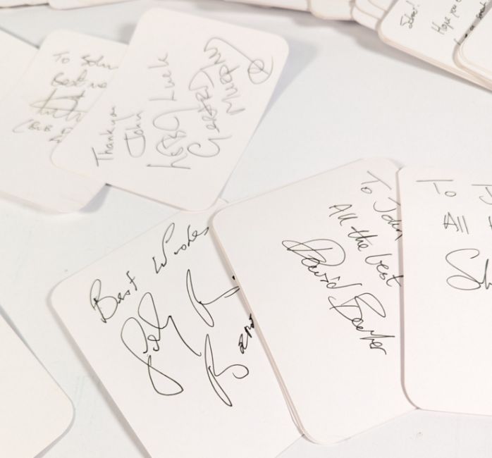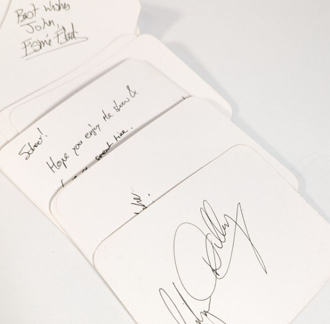 Autographs - a large collection of 100+ signatures, mostly unidentified. Known names include: Oliver Postgate (x2), Gary Kemp, Ian McNeice, Cannon & Ball, Tricia Penrose, Adam Hills, Omid Djalili, Sebastian Faulks, Ardal O'Hanlon, Dara O'Briain, Sebastian Faulks, Neil Gaiman, Fiona Shaw, Tia Carrere and others. All obtained from the 1960s to the 2000s by John Short, whose collection included actors, authors, circus performers, wresters, speedway, singers and film stars. (100+)