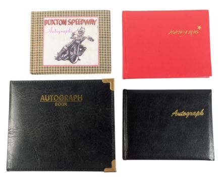 Autographs - a collection of x4 autograph albums containing various signatures. Including: Anne Charleston, Claire Sweeney, Andy Ford, John McArdle, Rusty Goffe, Diana Serra Cary (x3), Paul Merton, Peter Lord (Aardman Animations, plus sketch), Simon Gregson, Suranne Jones, and others. One book well filled, others with just a few signed pages. (4)