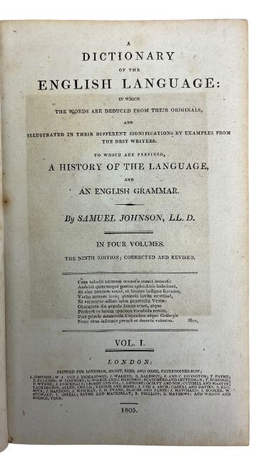 Johnson, Samuel. 1805 A Dictionary of the English Language. London: Longman, Hurst, Rees, and Orme. The ninth edition. Volume I, III and IV, lacking volume II. With the bookplate of R. Langmore. Bound in full contemporary diced calf with gilt detailing. With four volumes of The Quiver: An Illustrated Magazine from 1886-1888, comprising volume XX, XXI, XXII and a New and Enlarged Series. (7)
