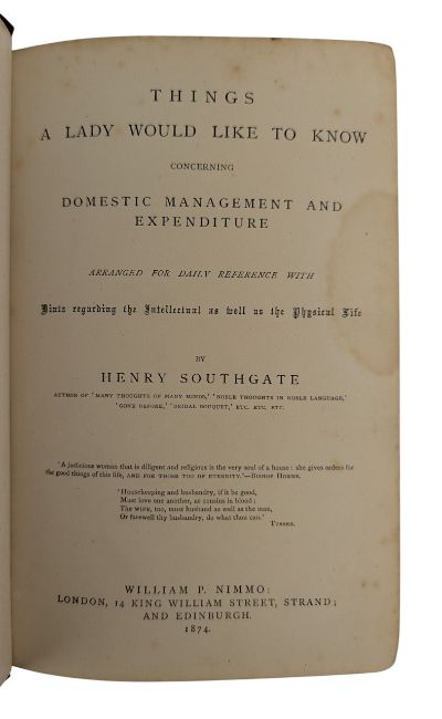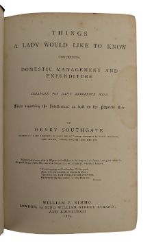 Southgate, Henry. 1874 Things a Lady Would Like to Know Concerning Domestic Management and Expenditure. London: William P. Nimmo. First edition. Very scarce. Arranged for daily reference with hints regarding the intellectual as well as the physical life. (1)