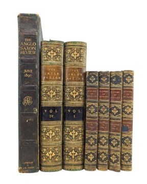Bindings. Six leather bound books; The History Of England From The Accession Of James The Second. 1871, Lord Macaulay. London, Longmans, Green & Co. Four volumes. Gilt decorated spines with leather panel work gilt titles. One board loose, others splitting. Plus, two volumes; The Irish Nation, Its History & Its Biography. Willis, James. 1871. Half calf bound with gilt tooled spines. Vols I and IV only. Marbled edges. Also; The Anglo Saxon Review, Vol I June 1890. John Lane, London & New York. Edited Lady Randolph Spencer Churchill. Gilt tooled boards with central shield front and rear, with leather spine titled in gilt. Some splitting, corner wear. (7)
