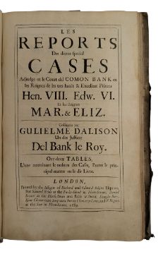 1689 Les Reports de Gulielme Benloes Serjeant de Ley, et Gulielme Dalison, Un des Justices del Banke le Roy. London: R. and E. Atkins. A collection of case reports from English serjeant-at-law and M. P., William Bendlowes. [12], 319, [17], 117, [11pp.]. In two sections with separate paginations, first section entitled Les Reports de Gulielme Benlow Serjeant de Ley, and the second section entitled Les Reports de deivers special Cases Adjuge en le Court del Comon Bank en les Reignes de les tres hault & Excellent Princes Hen. VIII Edw. VI. Et les Reignes Mar. & Eliz. (1)