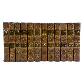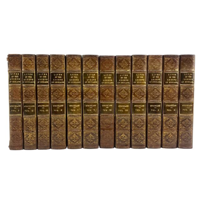 Strickland, Agnes. 1842-8 Lives of the Queens of England, From the Norman Conquest; With Anecdotes of their Courts. London: Henry Colburn. Twelve volumes. Bound in full calf with gilt detailing to the spine. Illustrated with a frontispiece and engraved title page. (12)