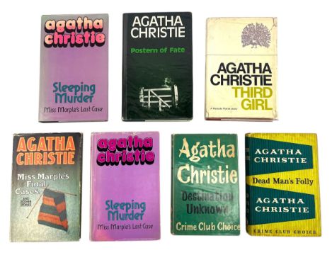 Christie, Agatha. A wonderful and bright collection of first editions and first Book Club editions of Agatha Christie detective novels. The first edition of Destination Unknown (1954), Postern of Fate (1973), Dead Man's Folly (1956), Third Girl (1966), Sleeping Murder (1976). With the Book Club / Book Club Associates edition of Dead Man's Folly (1957), Miss Marple's 6 Final Cases (1980), Sleeping Murder (1977), Ordeal by Innocence (1959) and Cat Among the Pigeons (1959). All copies with the publisher's original dust wrapper, apart from Dead Man's Folly, Ordeal by Innocence and Cat Among the Pigeons. (10)