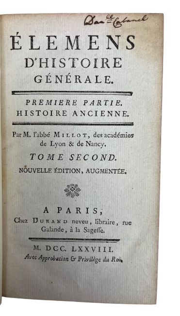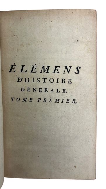 Millot, M. L'Abbe. 1778 Elemens d'Histoire Generale. Nouvelle Edition, Augmentee. A Paris: Chez Durand. A new edition of Claude-François-Xavier Millot's historical work. Six volumes. Bound in contemporary full calf. Written in the original French, covering ancient and modern history from the view of French historian and Churchman, Millot. (6)