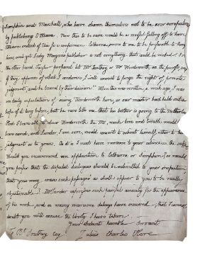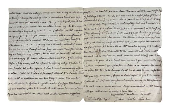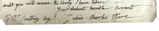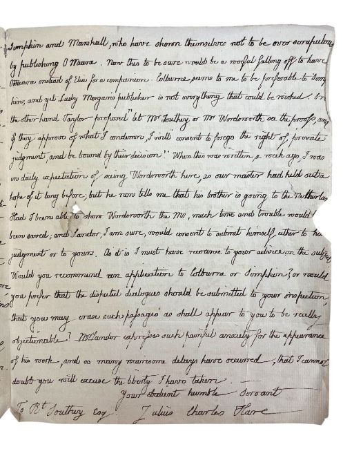 Hare, Julius Charles. A handwritten letter from English author Julius Charles Hare to poet Laureate Robert Southey. Written during Hare's time working at Trinity College, Cambridge, where he held positions between 1812 and 1832. In this letter, Hare discusses the controversies surrounding a work his brother is looking to publish; Hare explains that the manuscript has been rejected by a number of well-known publishers due to "violent expurgations of political feeling". Notable figures mentioned in the letter include William Wordsworth and Walter Savage Landor, as "Taylor", one of the publishers, encouraged Hare to submit the manuscript to Wordsworth and Southey to either approve or condemn. Written on one leaf of parchment, folded in half with writing on three sides. Address of Robert Southey is printed to the rear, with remnants of the original red seal. (1)