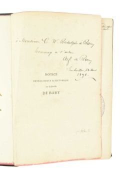 Genealogy. 1878 Notice Genealogique & Historique sur la famille De Bary, originaire de Tournay, en Hainaut etablie depuis 1806 a Guebwiller en Alsace par Alfred de Bary. Printed at Colmar by Vve J. B. Jung. Contemp. half morocco binding, bumped & worn with damage to the head of the spine, loss to extremities, edges red, from the library of the Church of the Immaculate Conception of Stroud with their stamps to endpapers, pastedowns, title page. Hand coloured engraved heraldic frontispiece, contemp. inscriptions of de Bary to half title & title page, some inscriptions throughout; binding strained & exposed at title page, one leaf of memoranda filled. 4to.