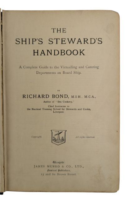 Bond, Richard. [1918] The Ship's Steward's Handbook. The author's presentation copy, inscribed "To Mother, from The Author. October 1918". First edition. Glasgow: James Munro & Co. Ltd., Nautical Publishers. A signed copy of this scarce work from Richard Bond, presenting "A Complete Guide to the Victualling and Catering Departments on Board Ship". Illustrated throughout and bound in the publisher's blue cloth. (1)