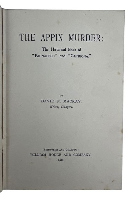Mackay, David N. 1911 The Appin Murder: The Historical Basis of "Kidnapped" and "Catriona". Edinburgh and Glasgow: William Hodge and Company. The first edition. Signed by the author "To J. R. Maefie Esq. from David N. Mackay 30.8.11.". Mackay's take on the high profile Scottish murder case of Colin Roy Campbell. (1)