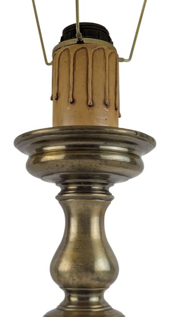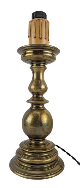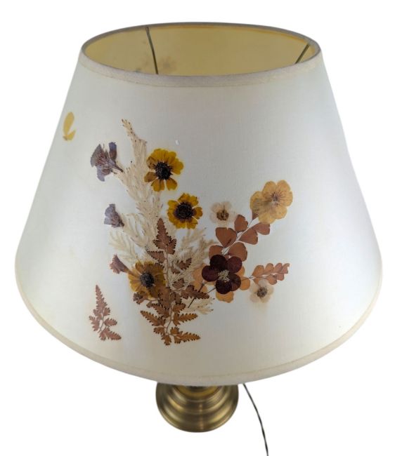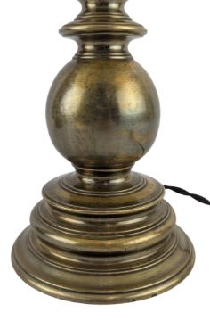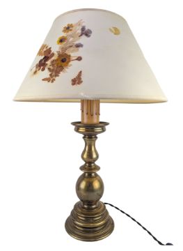 An Italian early 20th century heavy brass bulbous table desk lamp with floral mache conical shade. The lamp having a cream conical shade with flower mache decorations. Bulbous column-shaped brass body, all raised on circular foot. Sold as untested.