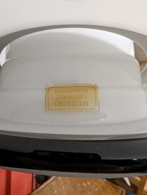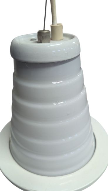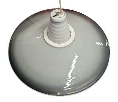 F. Fabbian, Made in Italy - a large Italian Murano vintage mid 20th century circa 1960s hand-blown milk glass UFO ceiling chandelier light. The ceiling pendant light having a large UFO-shaped glass shade in white with black edges. All held on a conical white & black body. Sticker reading 'Murano Originale Garantito'. Tag to ceiling mount.