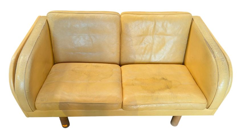 Jorgen Gammelgaard (1938-1991) - a retro 20th century Scandinavian Danish 1980s three seater sofa settee / daybed. The sofa having curved armrests with all-around slender cushions. All raised on cylindrical supports. Upholstered in yellow leather.