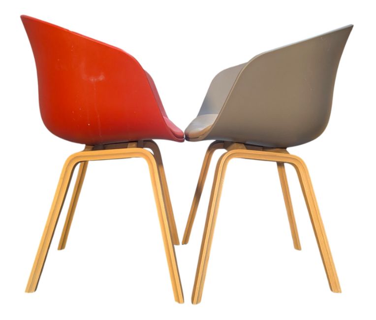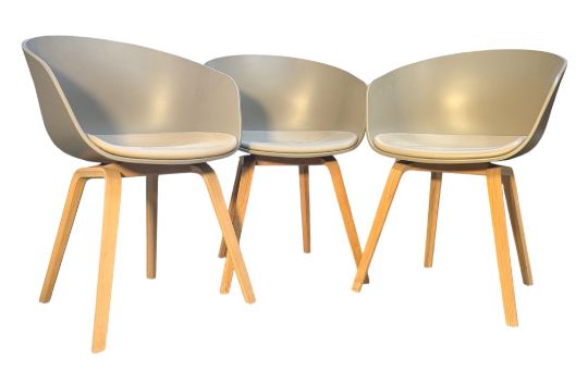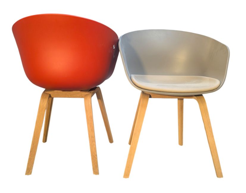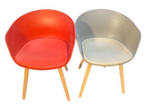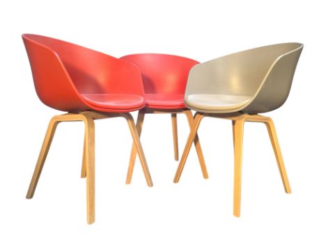 HAY, Hee Welling - About A Chair - AAC22 - a set of six contemporary minimalist polypropylene shell seats with curved backrest dining chairs. Each chair raised on four splayed oak supports. Four in grey finish, two in red finish. Stamped to the underside.