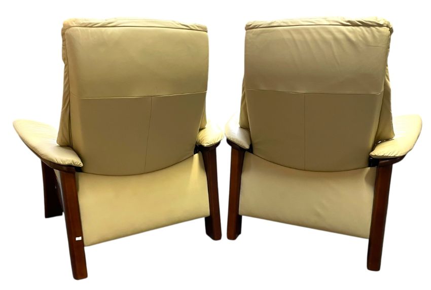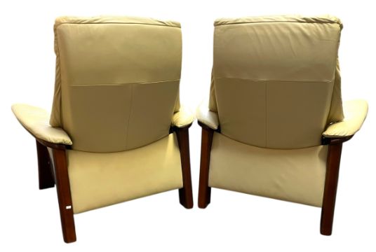 A pair of Contemporary Ekornes Stressless Windsor model teak-framed easy lounge armchairs. The chairs having a large white leather cushioned back rest and seat on straight supports.