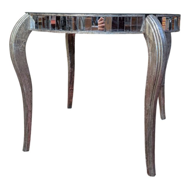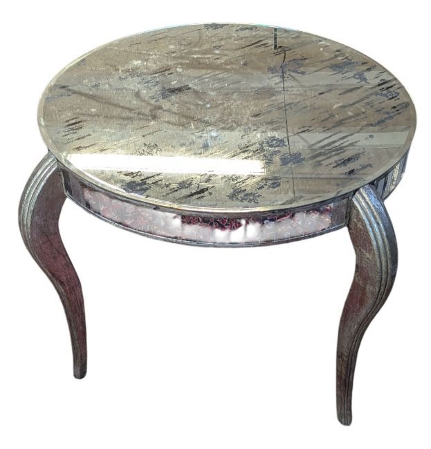 A contemporary designer mirrored dining/centre table. The table of circular form having silver painted wooden frame with mirrored glass top and sides. The mirror plates having a distressed finish to each, all raised sweeping supports.