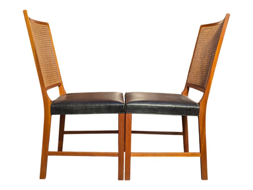 A matching set of six retro 20th century cane and teak framed dining chairs in the manner of Frits Henningsen. Each having teak frames with cane backrests and black leather seats. Each raised on straight leg supports united by stretchers.
