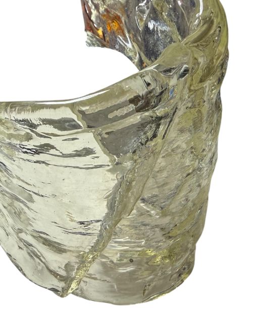 A pair of Italian Murano, possibly Mazzega, hand-blown glass & chrome metal wall light sconces. Each light having a curved shaped clear & orange glass shades, all held on scrolled tubular chrome supports with cylindrical wall mount. One light with broken end and a crack near wall mount.