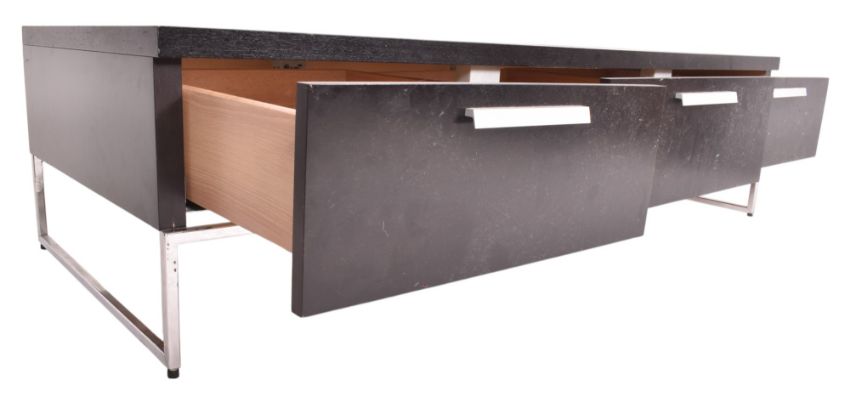 BoConcept - a high-end designer Wenge and chrome coffee table / media stand. The table of square form having a black Wenge top fitted with drawers with all supported by chrome tubular legs united by stretchers.