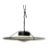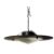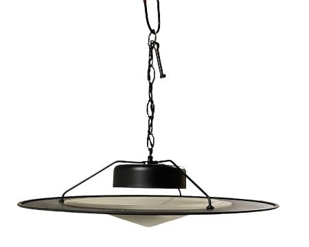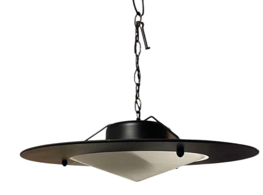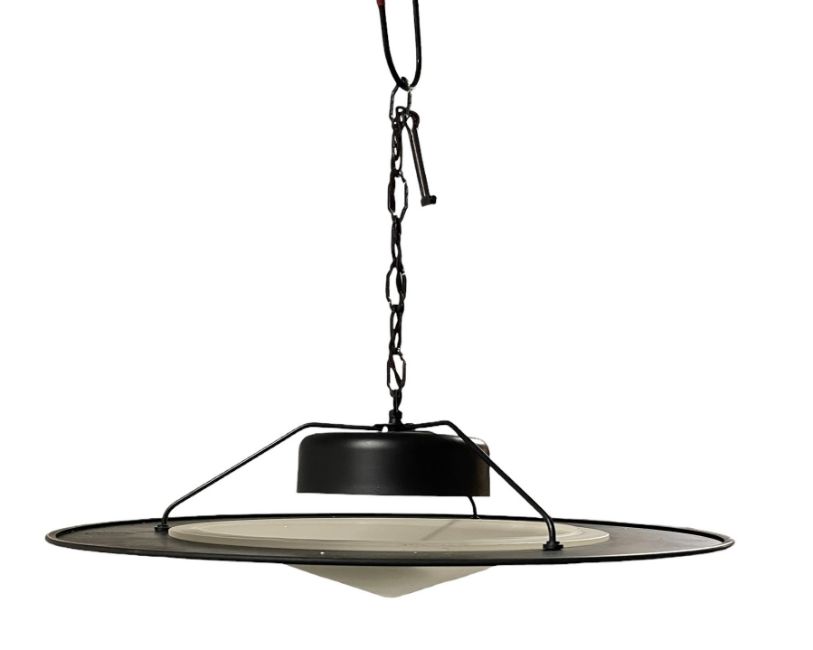An Italian Contemporary frosted glass and metal UFO ceiling pendant light. The chandelier having a three-arm and chain ceiling support holding a large black metal disc frame. Circular conical frosted glass shade to centre.