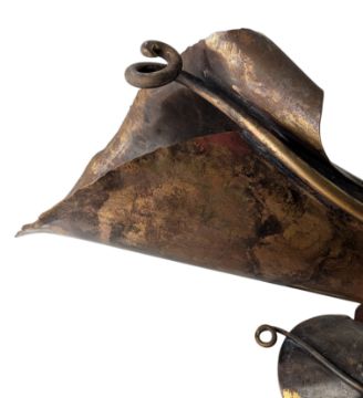 A set of four late 20th century Arts & Crafts style copper and brass worked wall lights / sconces in the manner of WAS Benson. Each of tulip form with scrolling tails and wall mounting brackets.