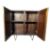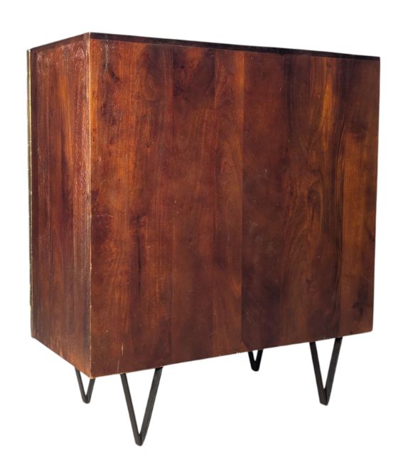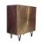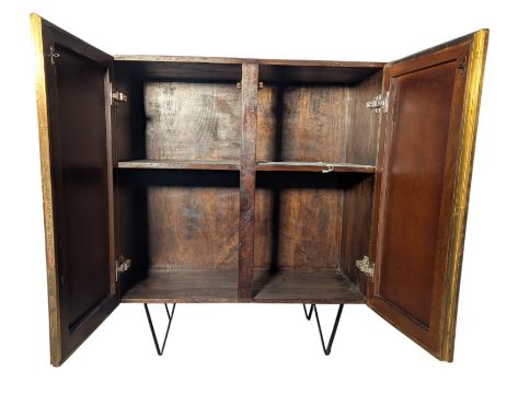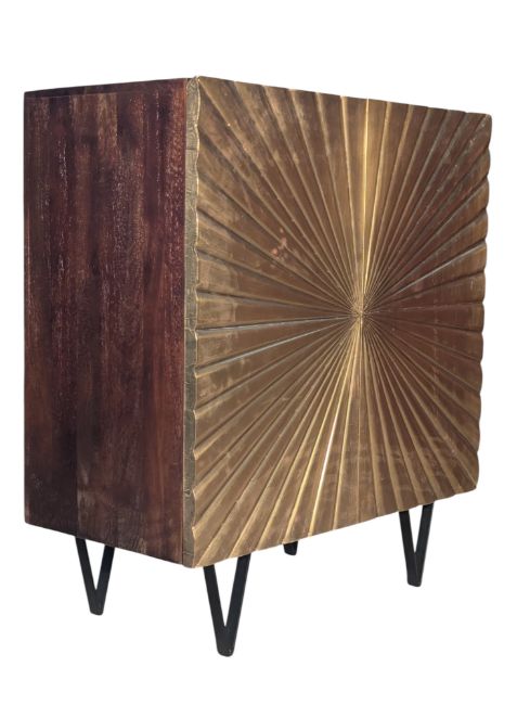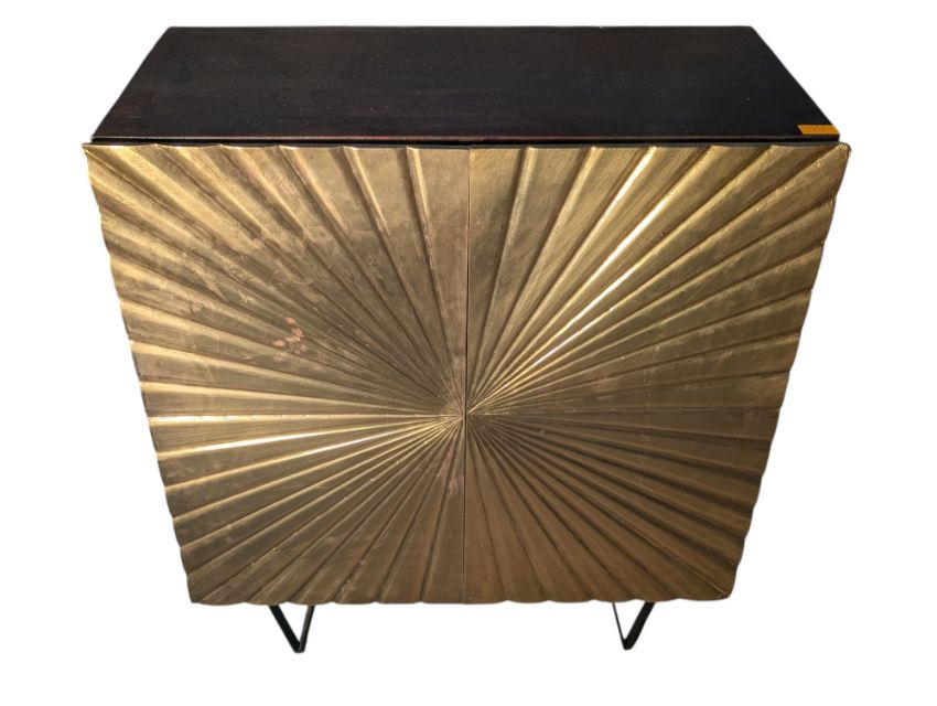Franklin Swoon - a high-end designer Hollywood Regency brass and dark mango wood twin door cupboard/cabinet. The cabinet having a starburst brass front with all raised on metal V-shaped supports.