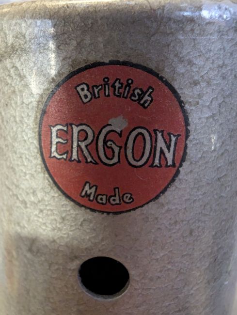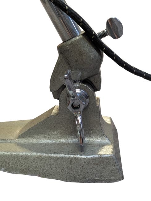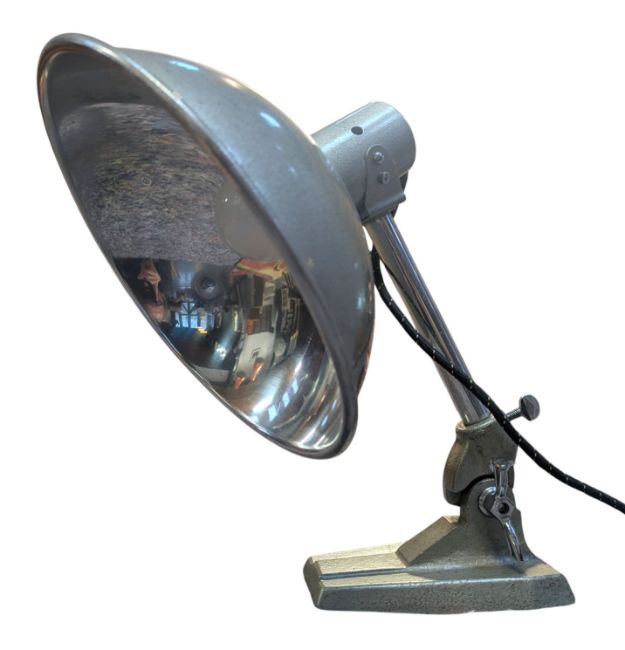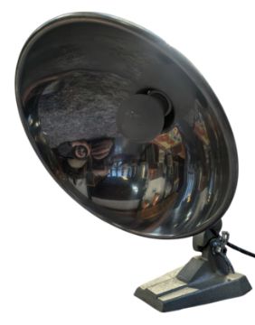 Ergon - a retro mid 20th century Ergon 'British Made' industrial heat lamp having been converted into a lamp light. The lamp having a large UFO shade raised on an adjustable stem upon a weighted base. Makers' label present. Sold as untested.
