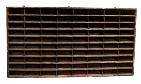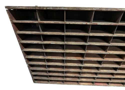 An early to mid 20th century vintage marine / naval signal flag cabinet / peigon holes. The cabinet of slender form having a ten by eight (eighty total) sectioned cubbyholes.