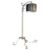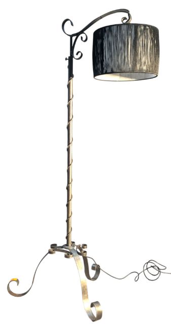 A French antique-style wrought-steel standard lamp light. The lamp having a silvered wrought-steel stem with wire-worked wrapped decoration and a black barrel shade. All raised on splayed scrolled supports. Sold as untested.