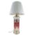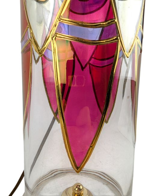 An Italian Art Nouveau style gilt and hand-painted clear glass table lamp. The lamp of cylindrical form with clear glass body decorated in pink and purple geometric motifs enclosed in gilt lining. Gilt metal mounts. Sold as untested.
