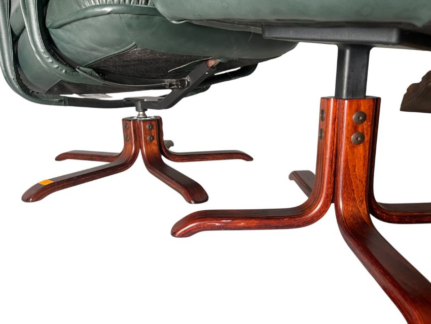 A retro 20th century Danish swivel lounge chair / easy armchair and matching stool. The chair and stool having green leather upholstered cushioned frames, with each being raised on a five-point wooden base.
