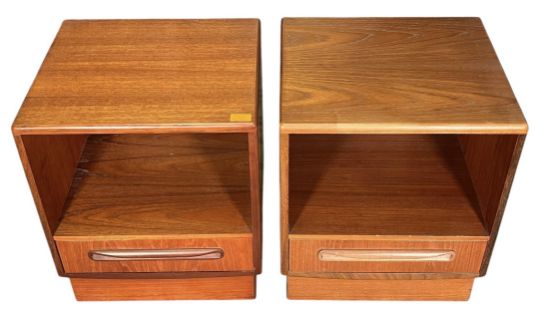 Victor B Wilkins - G-Plan - Fresco - A pair of retro mid 20th century teak bedside cabinets/chests. Each having a straight top over single-handled drawer. All raised on plinth base. Labels to the inside of drawer.
