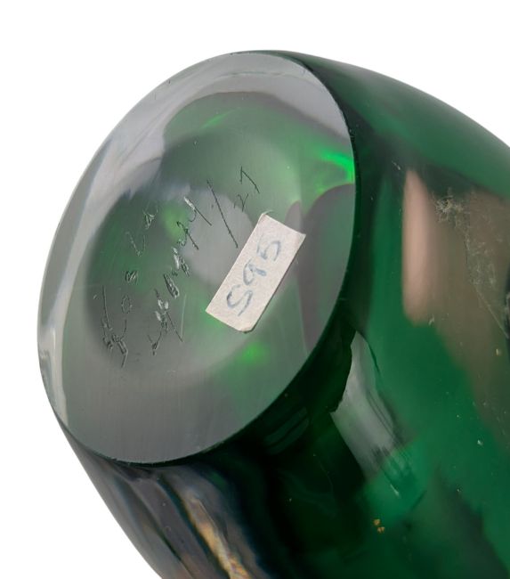 Vicke Lindstrand for Kosta Boda - a retro mid 20th century circa 1958 Swedish studio art glass vase. The vase having a clear and off-centre green glass case. Signed to the base. LH1444.