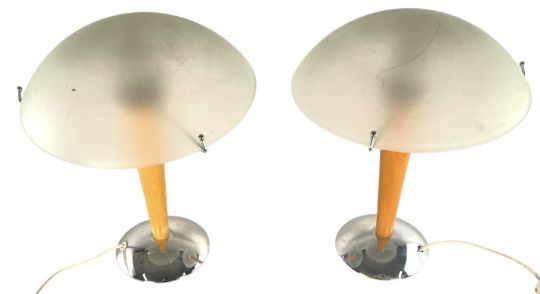 IKEA - Kvintol - a pair of vintage circa 1990s frosted glass and teak mushroom table lamps. Each having a dome-shaped frosted glass shade supported by chrome teeth. All raised on an inverted teak turned central support. All raised on chrome circular base. Sold as untested.
