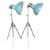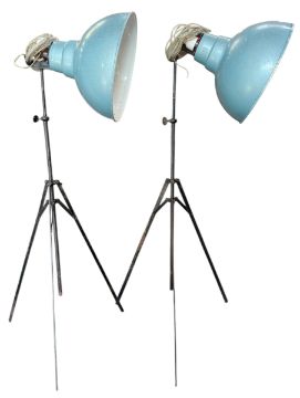A pair of retro 20th century painted metal tripod floor standard lamps. The industrial inspired lamps having a blue painted shade raised on a black metal adjustable tripod supports. Sold as untested.