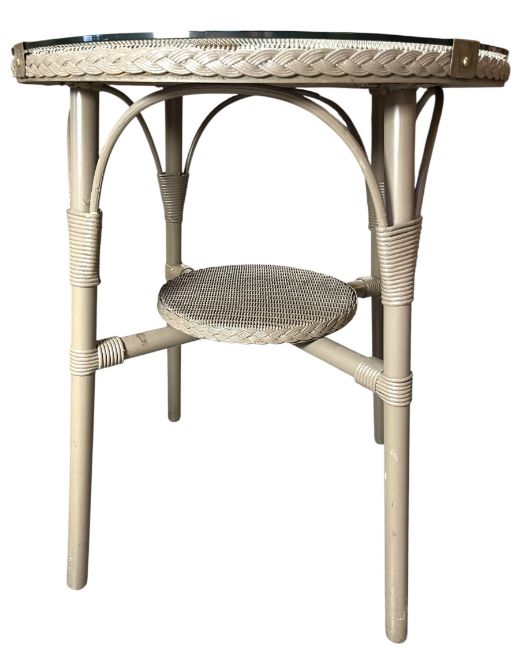 Lloyd Loom of Spalding - a set of Post Modern handwoven alloy frame and plastic loom garden/outdoor table with a pair of chairs. The table with a glass circular top and round undertier, together with a pair of straight back and curved elbow rests garden/outdoor chairs. Each with gilt Lloyd Loom plaque.