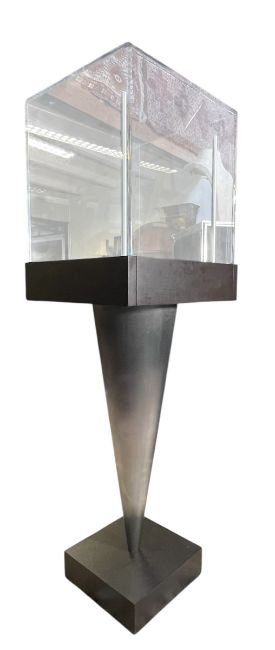 Lugano Jewellery - a large modern, professional, portable, high-end jewellery display case housed within a flight case. The jewellery cabinet housed within having a perspex display case top raised on a tapering polished metal stem and wooden base. With internal accessories. The flight case having metal banding with carrying handles to each side with all being raised on castor wheels. Lugano advertising to the front.