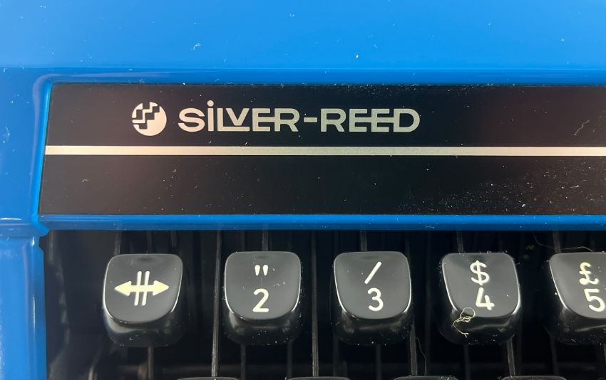 Silver-Reed - Silverette II - a retro 20th century 1980s blue-cased travel typewriter. The typewriter finished in electric blue with an outter black case. Maker's marks present.