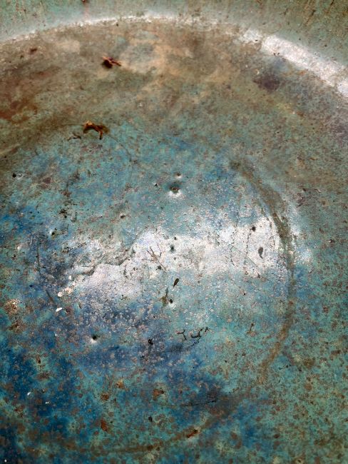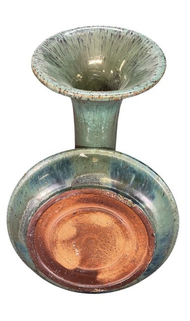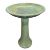 A modern turquoise-glazed pedestal bird bath. Circular top raised on tapering stem upon a rounded foot. All finished in a mottled turquoise glaze.