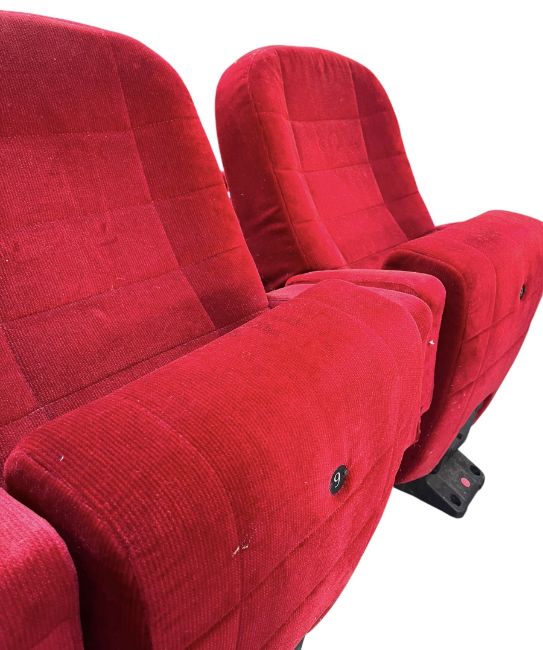 Six single vintage Post Modern red velour upholstered cinema theatre chairs. Each folding armchair having a padded backrest, seat and elbow rests. Each raised on a pedestal support.