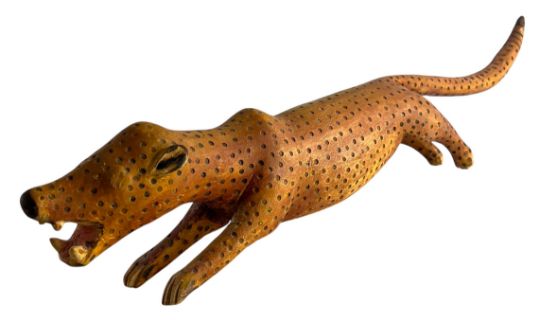 A later 20th century Folk Art style carved wood model of a Cheetah. The Cheetah is shown running with legs and tail extended with details throughout.