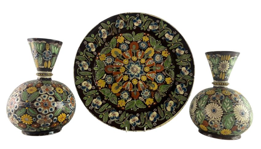 Thoune - a selection of late 19th / early 20th century Swiss studio pottery. The collection includes a pair of baluster-form vases and a charger plate. Each pieces decorated in polychrome with flowers