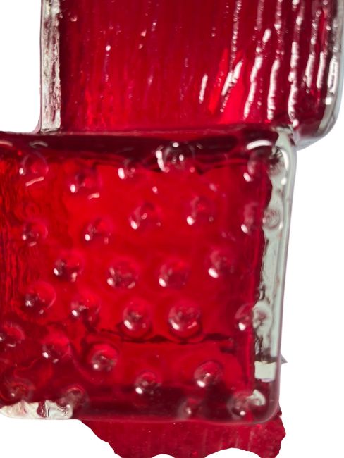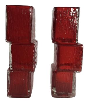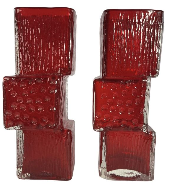 In the style of Geoffrey Baxter for Whitefriars - Drunken Bricklayer Vase - two 20th century glass vases in the manner of the iconic Drunken Brick Layers vase. Each in a ruby red colourway with a textured finish.