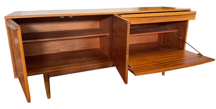 Neil Morris for Morris Of Glasgow - a 1960s retro teak wood sideboard credenza. The sideboard having an arrangement of one drawer over a fall front drinks / cocktail cupboard to right. To the left a double door cupboard with all having wide curved handles. All raised on tapering legs. Maker's signature mark to inner door.