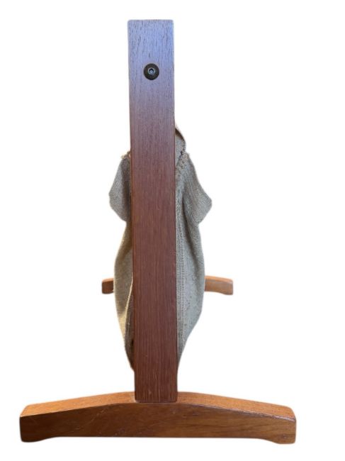 BRDR Furbo, Spottru - a retro mid 20th century 1960s Danish designer teak and linen magazine rack. Teak frame with linen baskets to each side. Raised on trestle supports.