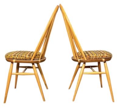 Lucian Ercolani for Ercol - a retro 20th century Windsor pattern beech and elm drop-leaf dining table and matching four dining chairs. The table having an elm top raised on beech splayed supports. The four chairs in the Quaker pattern with spindle hoop backs, solid elm seats raised on splayed supports with orange chequered seat cushions.