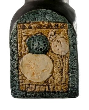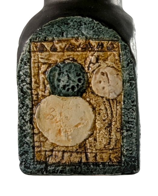 Jane Fitzgerald for Troika - a retro 20th century Cornish studio art pottery spice / chimney vase. The vase having a black glazed neck with geometric designs to each face. Signed to the base.