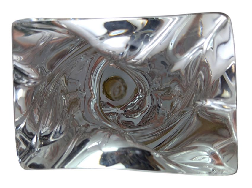 A vintage Baccarat crystal glass spiral twisted lamp base with white metal mount atop. Stamped to underside, unwired. Together with a crystal glass unmarked abstract vase/posy.