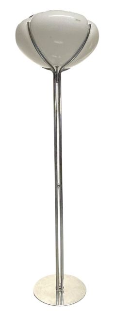 Harvey I. Guzzini - iGuzzini - Quadrifoglio - a retro 1960s Italian designer Space Age standard lamp / floor standing lamp light. The lamp having a white acrylic shade supported on a chrome stem with all being raised on a circular weighted base. Maker's label present.