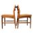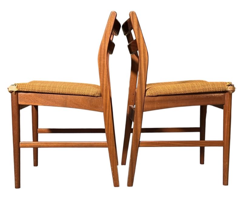 British Modern Design - a retro mid 20th century Danish influenced teak dining table and matching six chairs. The extending table having an oval top with a hidden central leaf with all raised on tapering supports. The set of six chairs having a rail backrests with padded seats. Each raised tapering legs united by stretchers.