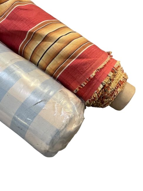 Designer Fabric - a selection of six modern designer fabric rolls. Examples from designer Ian Mankin, Colefax & Fowler and others. A mix of examples from blue chequered to red and gold striped. Good length to each with some brand new examples.